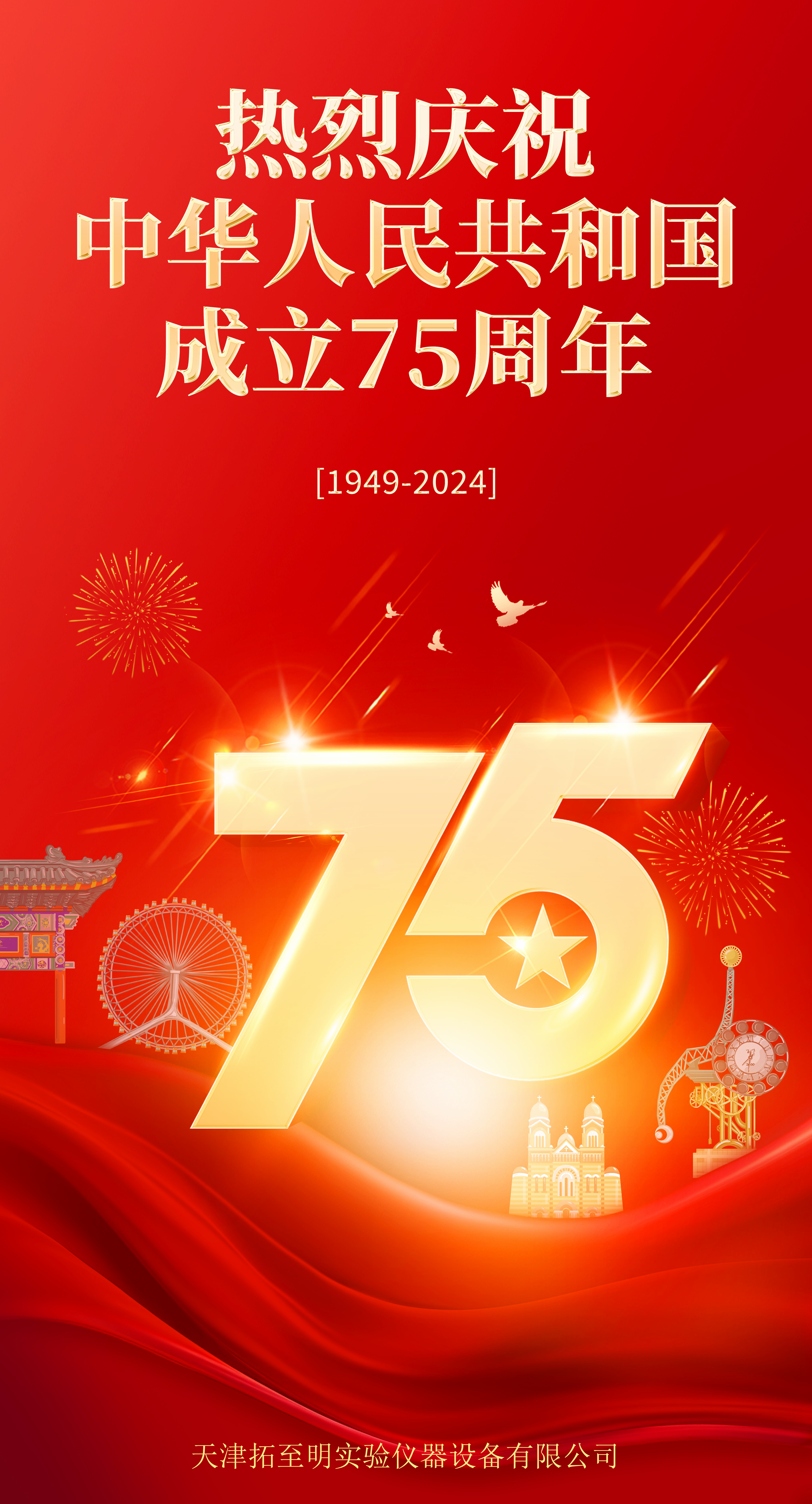 2024年,我们迎来了中华人民共和国成立75年华诞。风雨兼程,春华秋实!75年来,在党的坚强领导下,中国迈向全面小康、繁荣富强,创造了人类发展史上的伟大奇迹!今天的中国我们为之骄傲,目光所至,家国安好。让我们共同祝愿亲爱的祖国:生日快乐!繁荣富强!国泰民安!